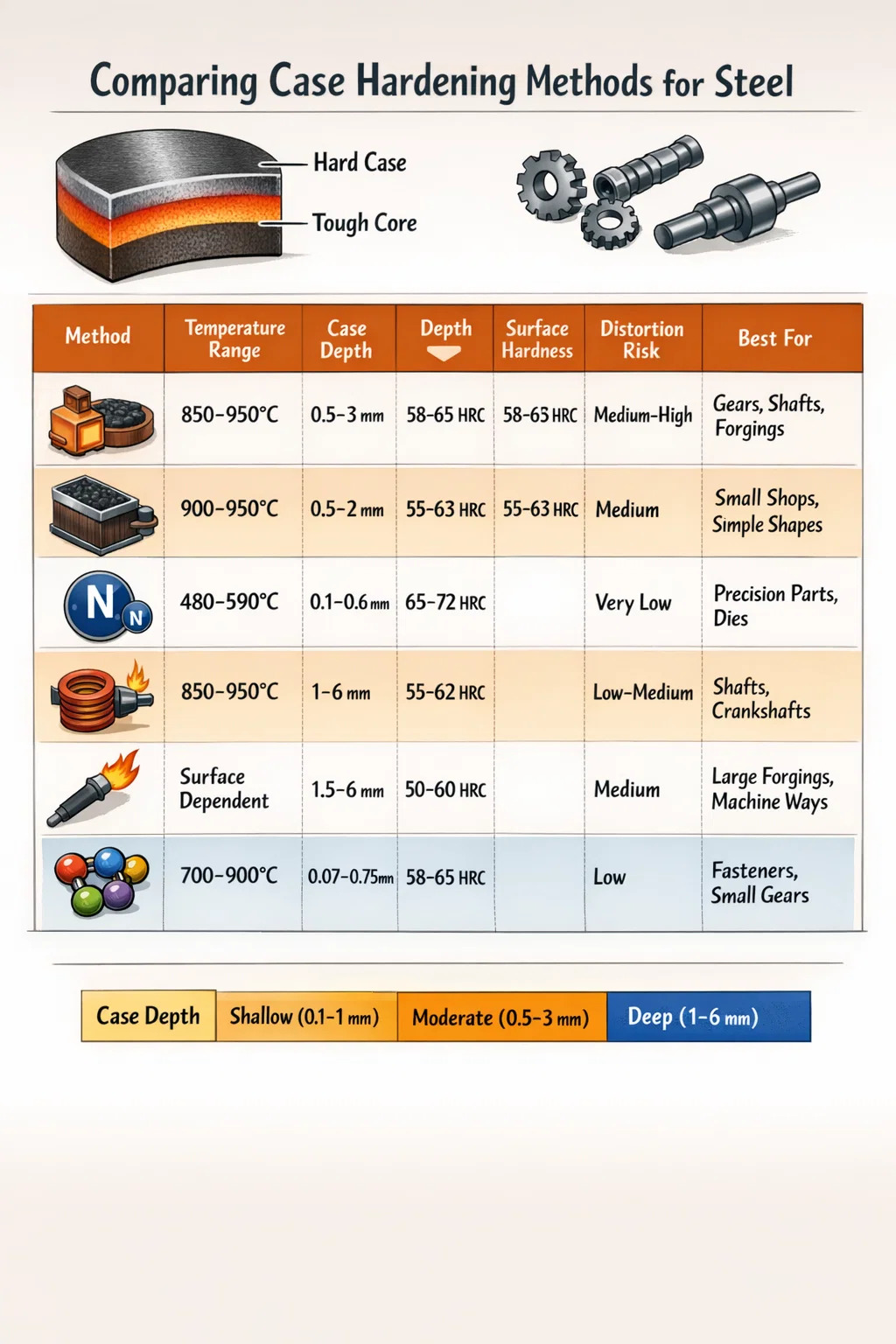 | Metoda | Zakres temperatur | Głębokość obudowy | Twardość powierzchni | Ryzyko zniekształcenia | Najlepsze dla |