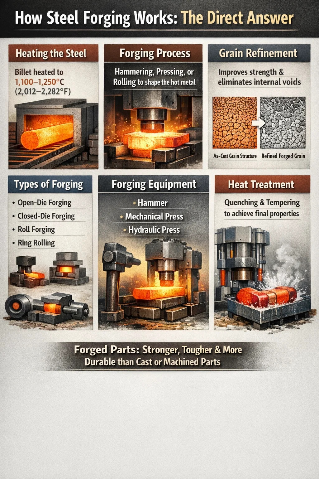 Kucie stali to proces kształtowania stali poprzez przyłożenie siły ściskającej — poprzez młotkowanie, prasowanie lub walcowanie — podczas gdy metal jest podgrzewany do temperatury, która czyni go plastycznym i urabialnym, ale nie stopionym. Rezultatem jest część z doskonałe właściwości mechaniczne w porównaniu do elementów odlewanych lub obrabianych maszynowo, ponieważ proces kucia udoskonala wewnętrzną strukturę ziaren i eliminuje wewnętrzne puste przestrzenie.