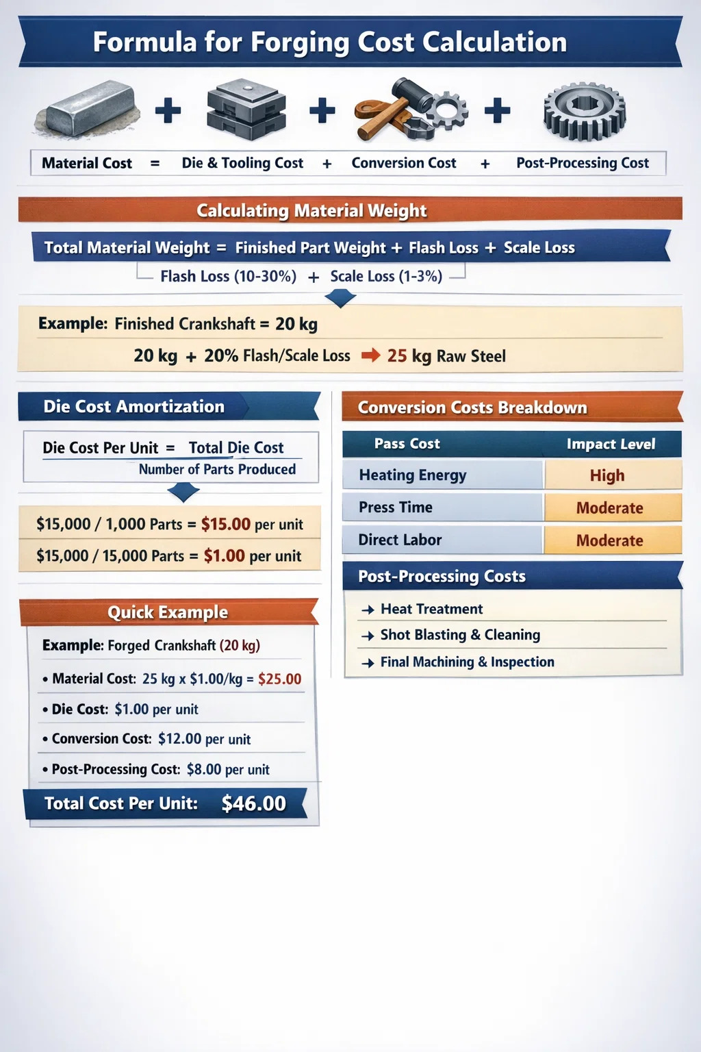 Obliczanie całkowitego kosztu kucie stali polega na zsumowaniu czterech głównych filarów: Koszt materiału (masa netto plus ubytek wypływu), Koszty oprzyrządowania/matrycy (amortyzowane przez okres produkcyjny), Koszt konwersji (energia, praca i koszty ogólne maszyny) oraz Koszty przetwarzania końcowego (obróbka cieplna i obróbka skrawaniem). W przypadku standardowej przekładni średniej wielkości materiał zwykle stanowi 40% do 50% całkowitej ceny jednostkowej, podczas gdy oprzyrządowanie jest największą zmienną początkową.