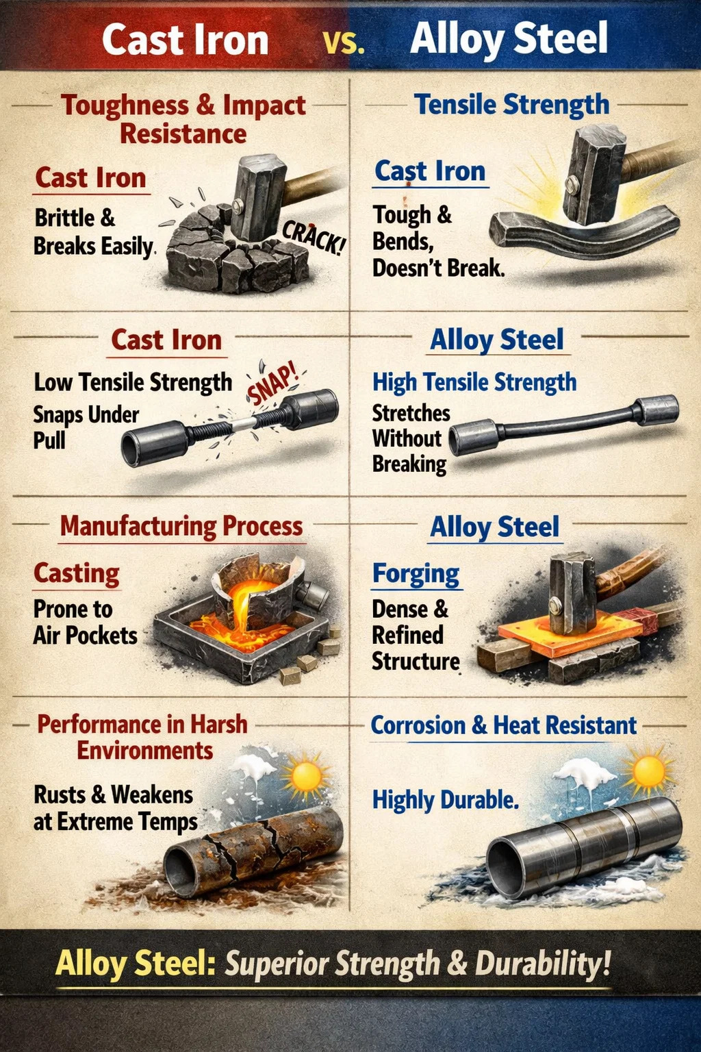 Stal stopowa jest na ogół mocniejsza i trwalsza niż żeliwo, szczególnie gdy jest poddawana uderzeniom, naprężeniom i dużemu naciskowi. Chociaż żeliwo ma swoje mocne strony w niektórych specyficznych zastosowaniach (takich jak produkcja garnków lub podstaw obrabiarek), stal stopowa jest materiałem lepszym pod względem ogólnej wydajności.