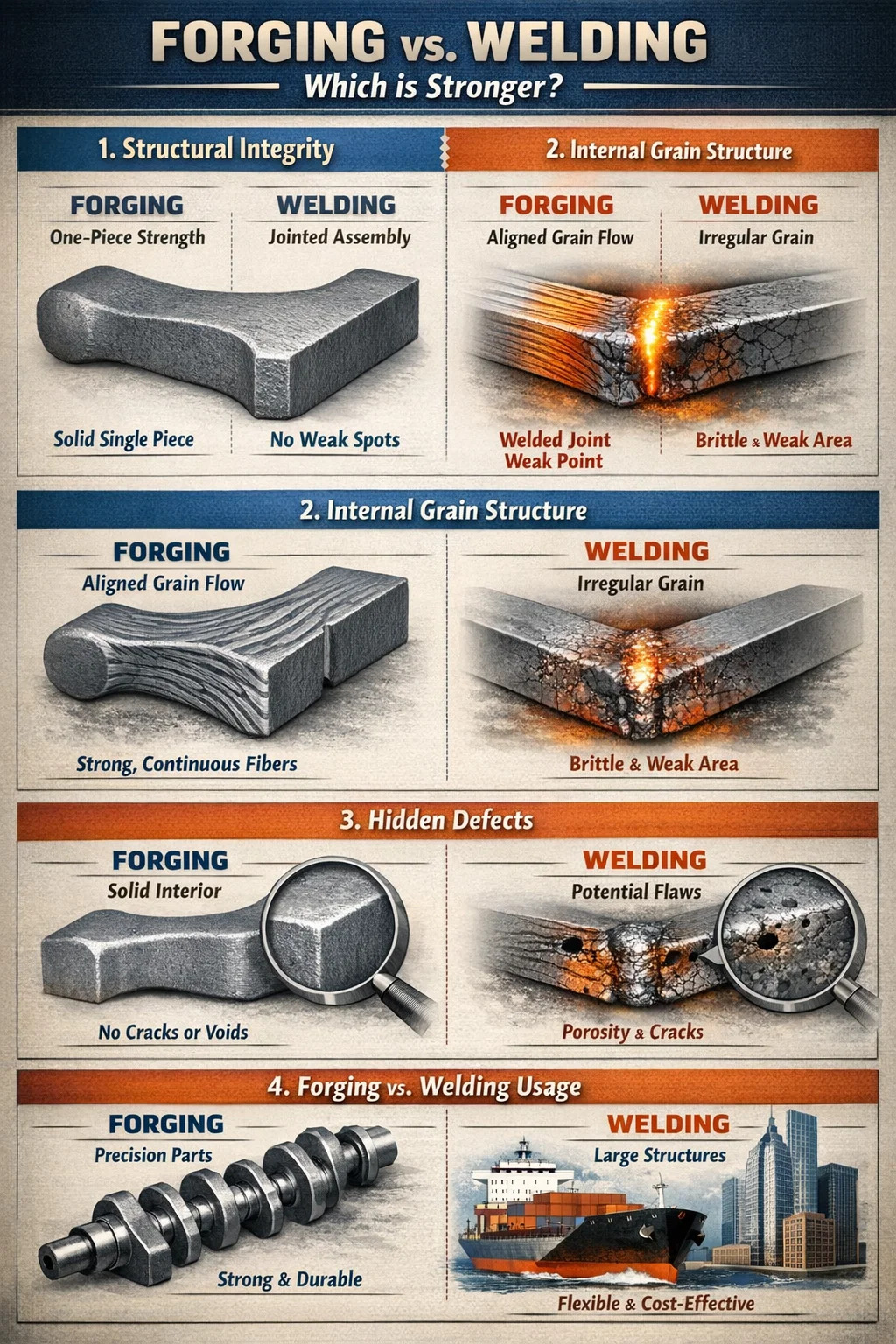 To bardzo klasyczne pytanie. Prosta i bezpośrednia odpowiedź brzmi: w większości zastosowań wymagających dużych naprężeń i zastosowań krytycznych kucie jest rzeczywiście mocniejsze i bardziej niezawodne niż spawanie.