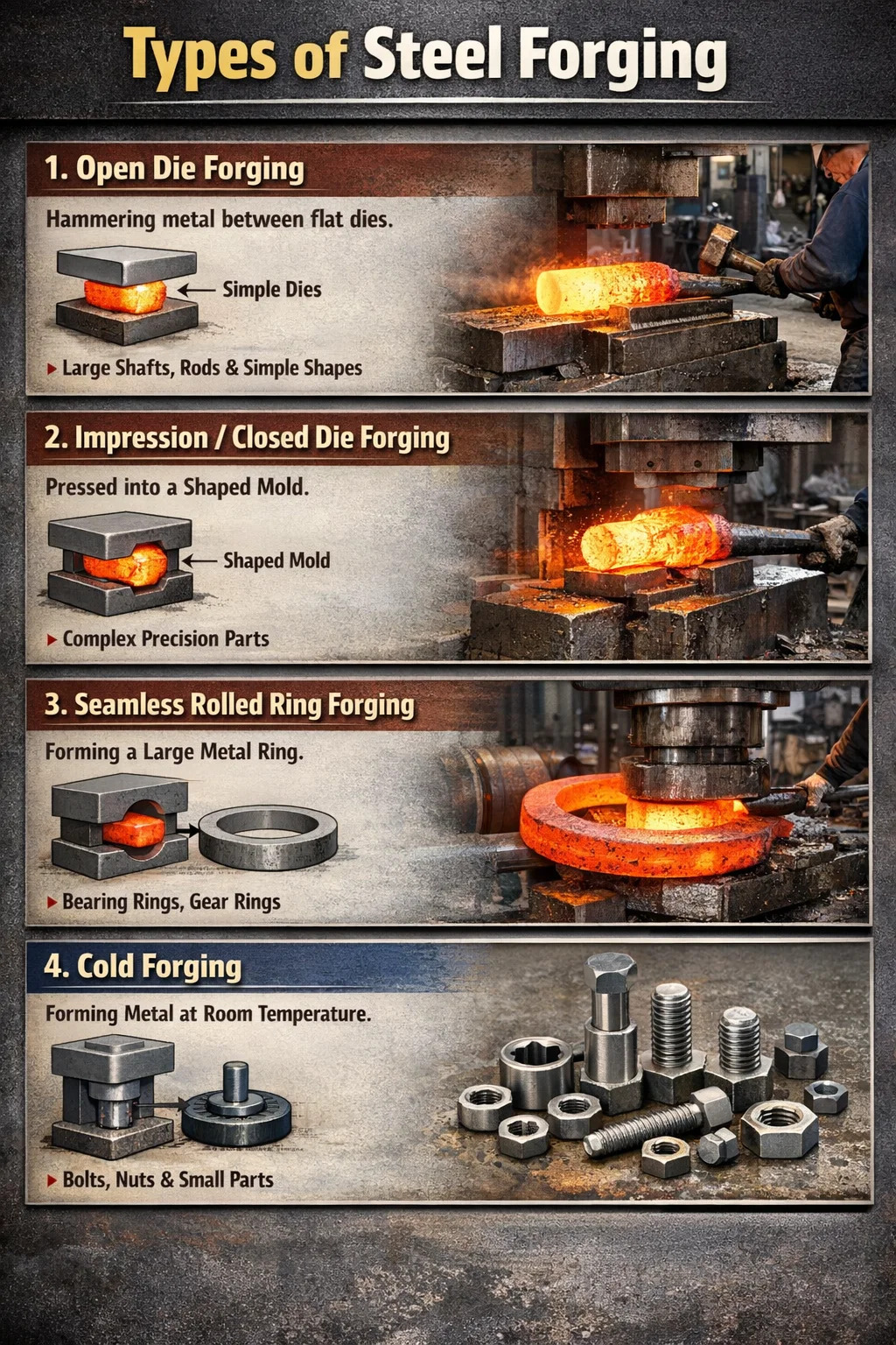 W dziedzinie obróbki metali istnieje wiele różnych procesów kucia. Według najpowszechniejszej metody klasyfikacji, kucie stali można zazwyczaj podzielić na następujące cztery kategorie: