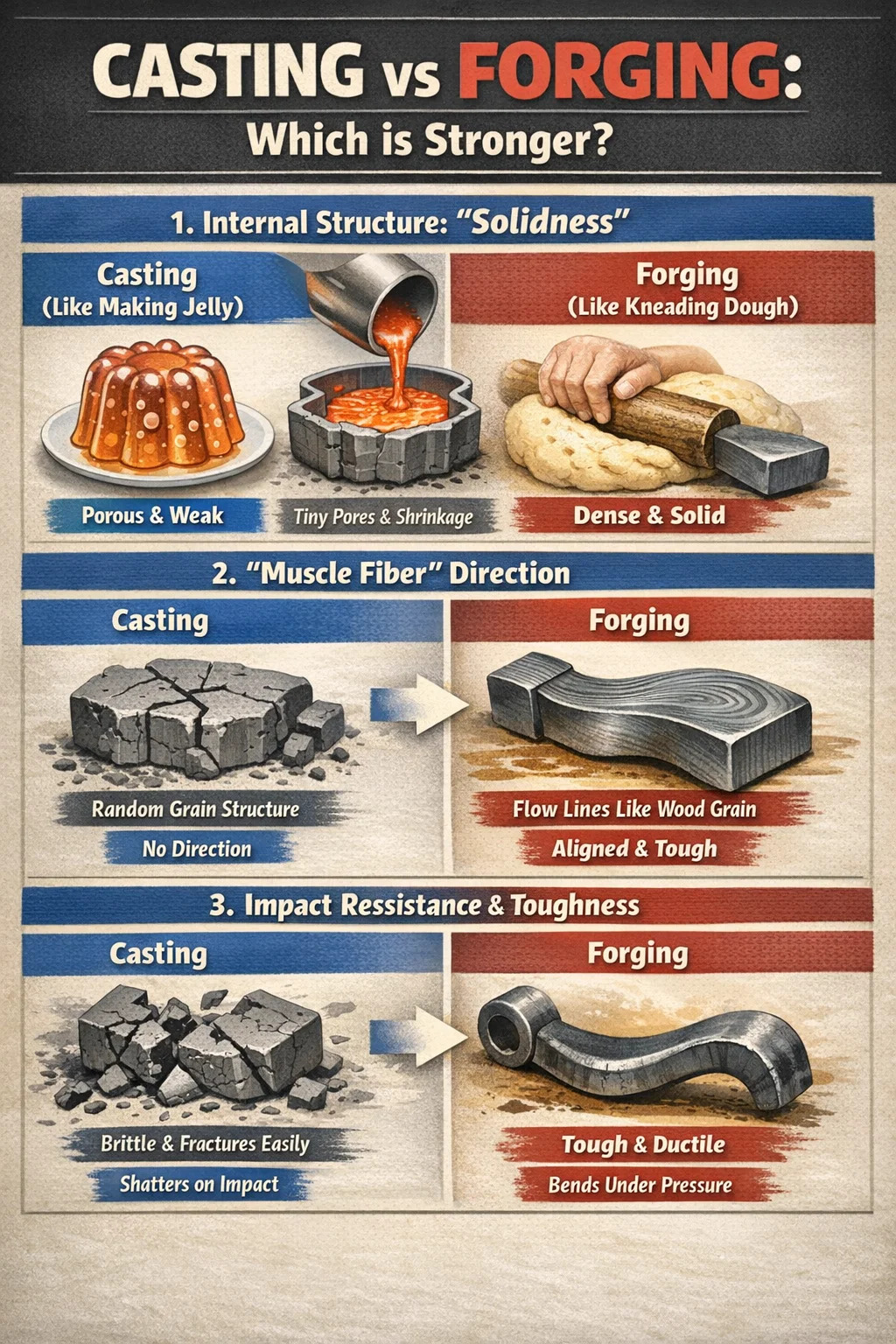 Jeśli porównamy metal ze składnikami żywności, odlewanie przypomina „robienie galaretki”. kucie stali przypomina „zagniatanie ciasta”. Chociaż oba mogą stworzyć pożądany kształt, gęstość wewnętrzna i odporność na uderzenia są zupełnie inne.