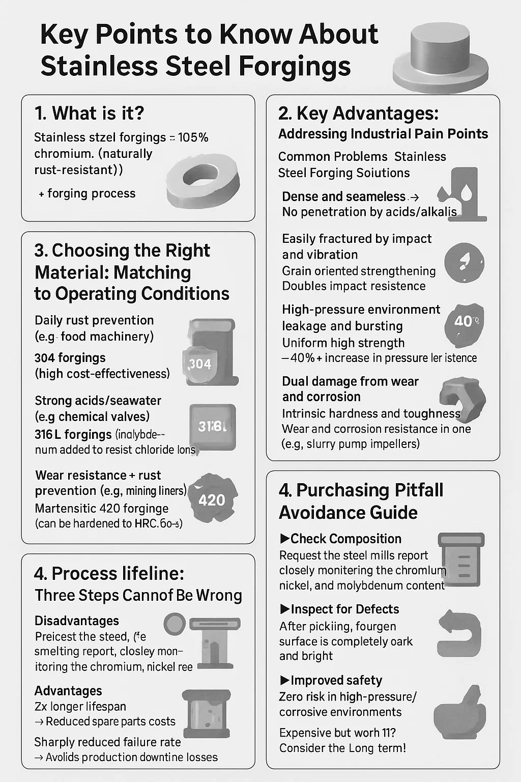 Odkuwki ze stali nierdzewnej = Stal nierdzewna (zawierająca ≥10,5% chromu, naturalnie odporna na rdzę) proces kucia (młotkowanie w wysokiej temperaturze).